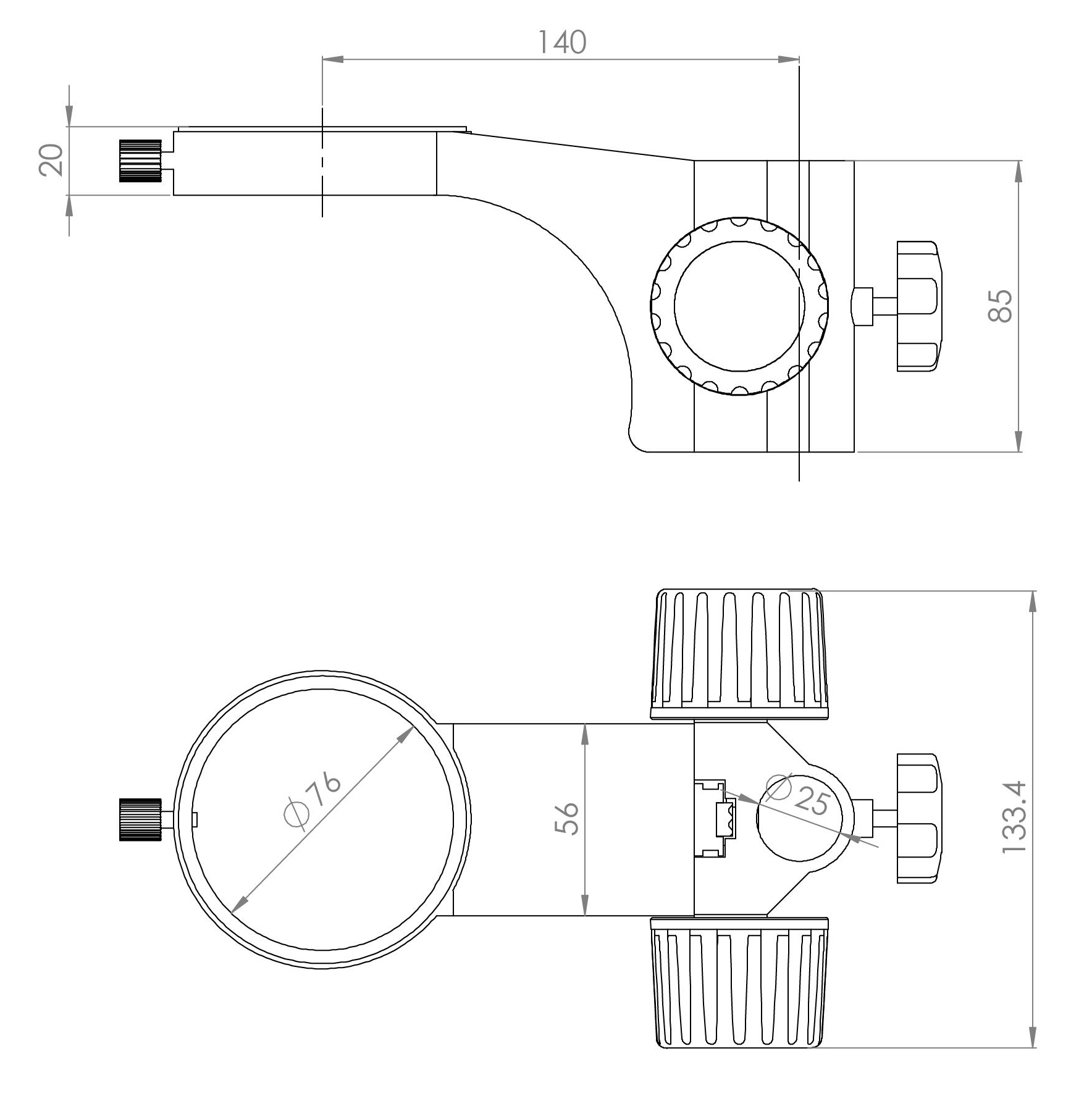 型號名稱:SF8升降組 說 明: ● 金屬燕尾滑塊,立柱安裝孔直徑Φ 25mm ● 鏡體安裝孔直徑Φ 76mm ,兩孔中心距 140mm